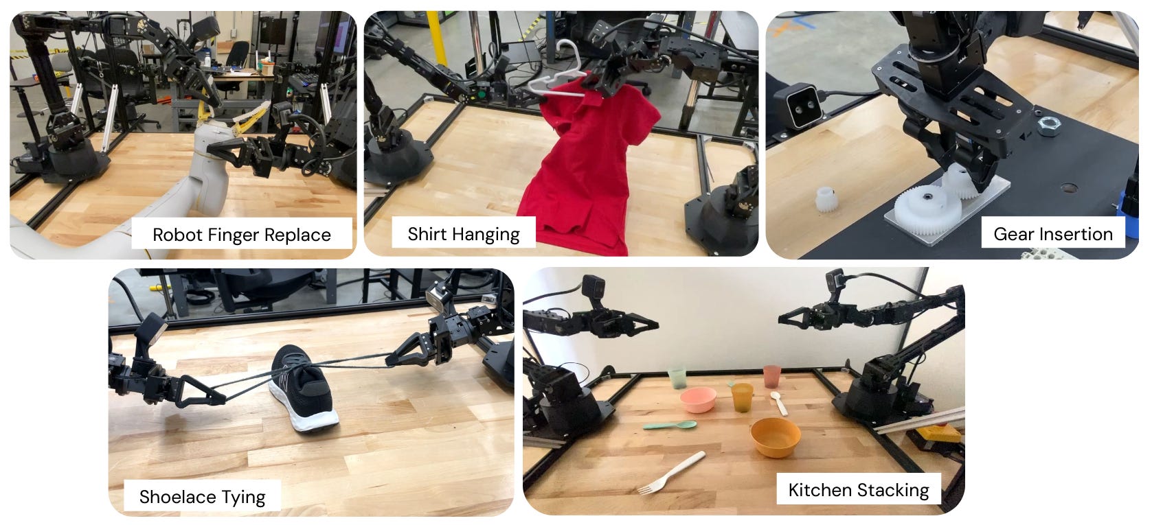 As another point of comparison, we can look at ALOHA Unleashed, a somewhat older paper from the Google Deepmind team which performed a large number of very long horizon tasks: hanging up a shirt, tying shoelaces, etc. However, these were all diffusion policies that were trained separately. Each one of these single-task models took 5,000-6,000 demonstrations! While all of these models require a lot of data, there’s still a massive improvement from fine-tuning the multi-task model.
