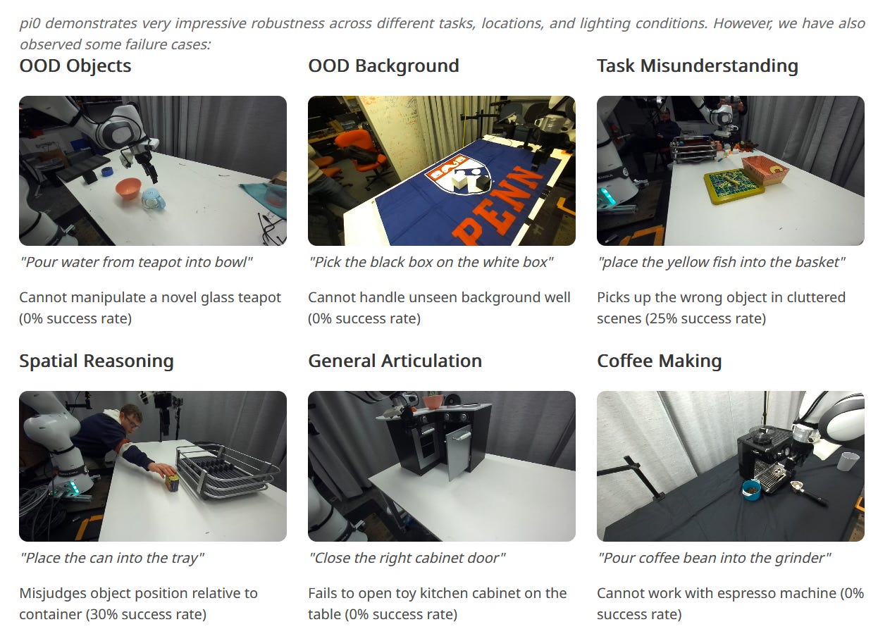 Current VLAs are not by any means perfect. Users report all kinds of weaknesses, including lack of collision avoidance, lower success rates, and failures at fine-grained manipulation. We’ll look at a few specific problems, though, that we need to address.