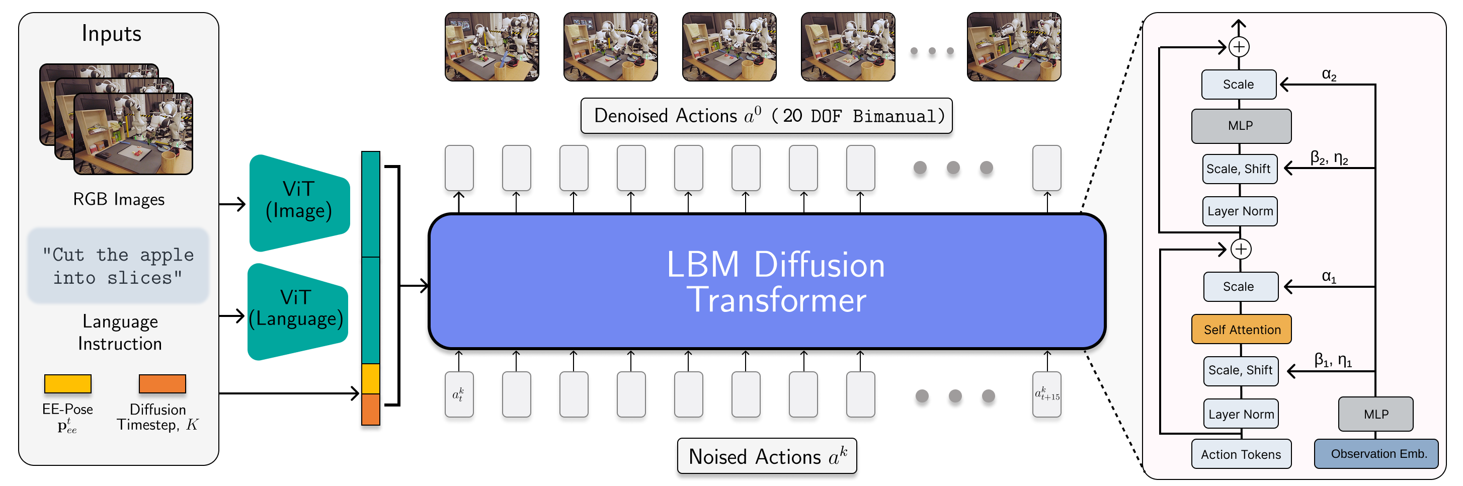 We can see a similar architecture in the recent TRI “large behavior models” work, though with one notable caveat; in this case, instead of a full-fledged VLM, they just use the CLIP image and text encoder. CLIP is a powerful but comparatively lightweight image-language encoder that’s been used in various cool robotics projects. But take a look at the architecture: