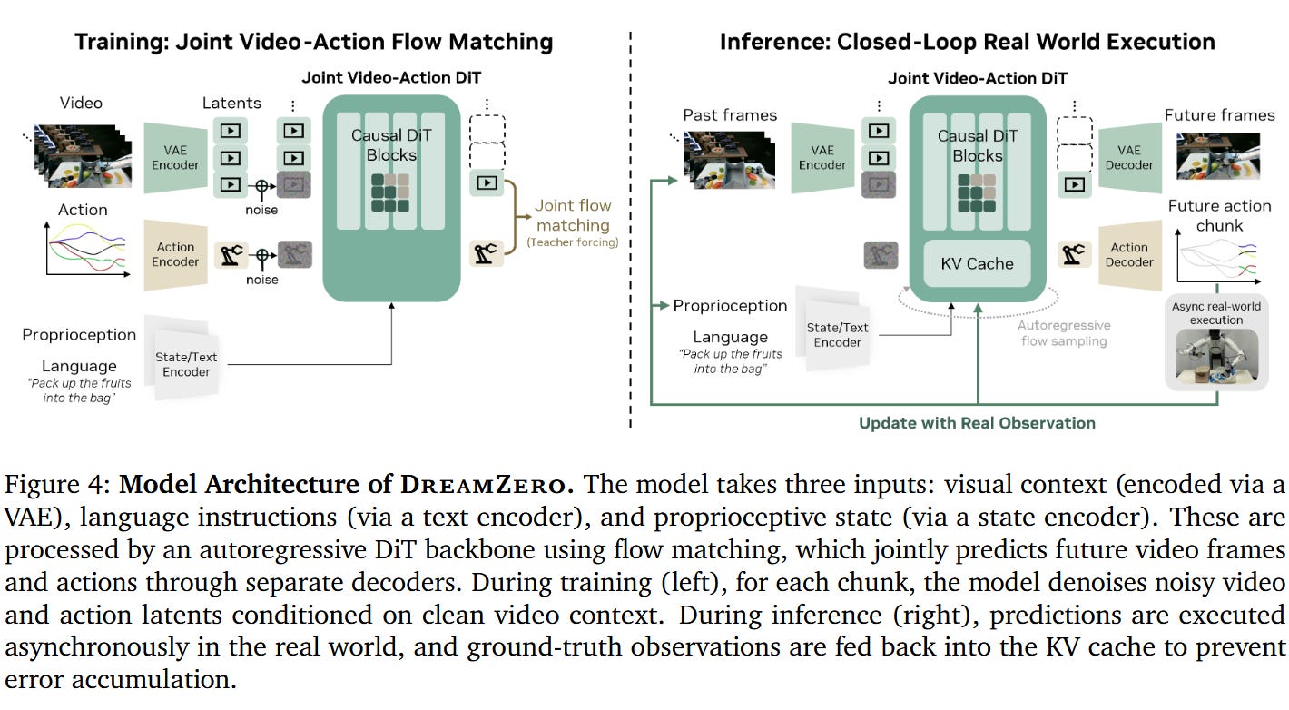 DreamZero is a “world-action model” from NVIDIA. In practice, this takes a lot of the concepts from world models — principally that video generation is useful for robotics — but changes the formula in a couple key ways. Most crucially, it jointly models action generation and video generation.