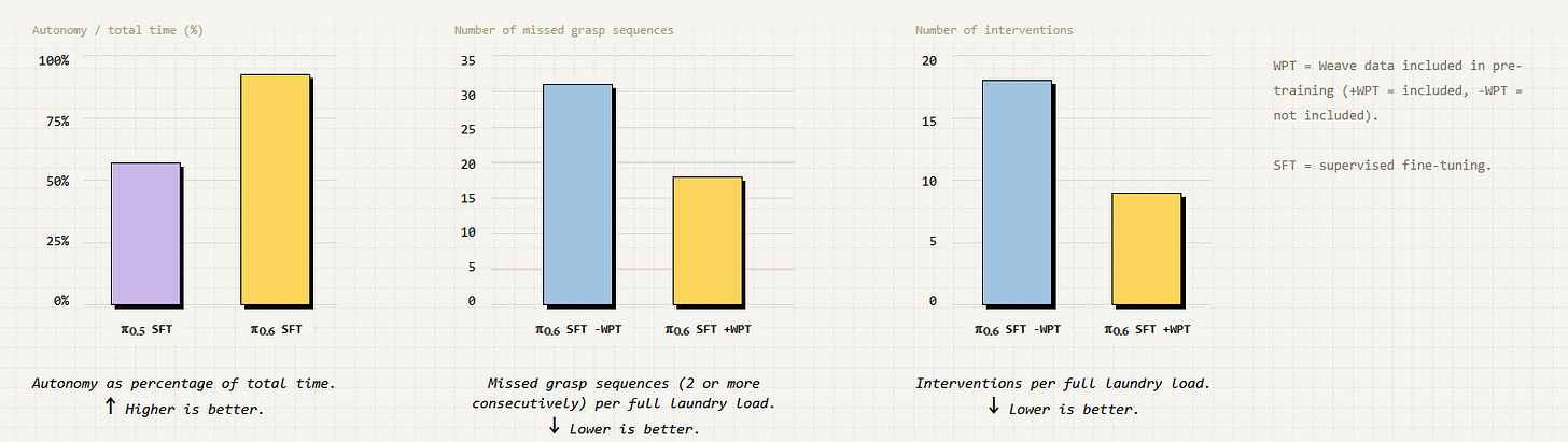This also seems to suggest to me that possibly the additional 10k hours of robot data is not as useful as people think. Pretraining on the right robot data does seem very important; in another recent blog post, Physical Intelligence showed a massive gain from pretraining on in-distribution partner data:
