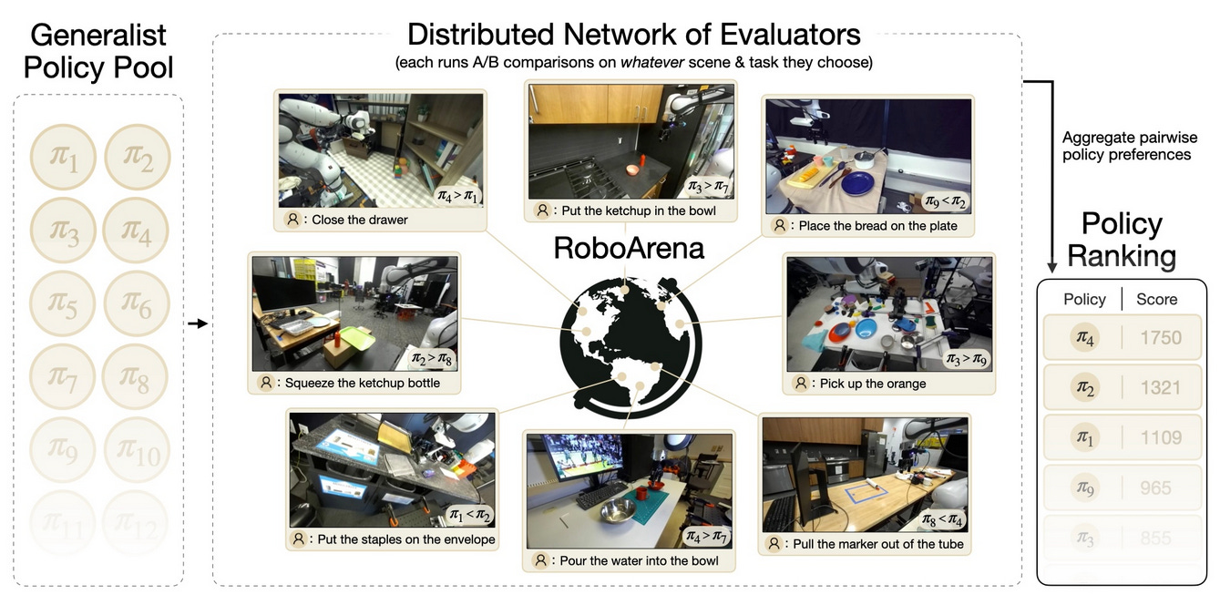 RoboArena is a distributed “real world” benchmark based on Droid. Evaluators across the world have somewhat similar robots and setups, and run a set of open-ended robotics evaluations with different natural-language commands.