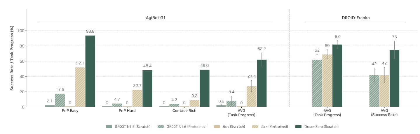 It’s a new benchmark that’s definitely not close to saturated yet. And DreamZero performs well on both: