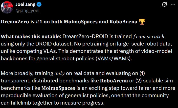 The team at NVIDIA recently released a set of robotics models; one that’s been driving a lot of discussion online lately has been DreamZero: a “World-Action Model” which predicts video in addition to robot actions. In particular, it achieved benchmark-topping results at two very interesting benchmarks this week: RoboArena and MolmoSpaces: